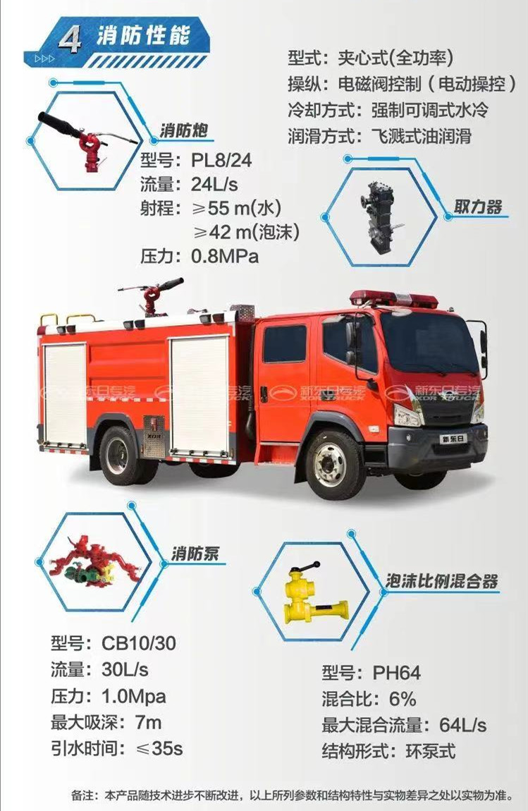 上裝配置:罐體容積6立方,配備上海茸申CB10/30消防泵,成都威斯特PS30炮,水射程:≧50m,整車顏色消防紅。